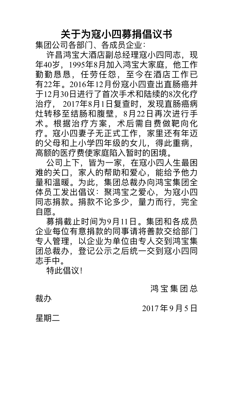一人有難,八方支援。在得知寇小四同志的困難情況后,鴻寶集團發(fā)出“為寇小四募捐倡議書”的號召。