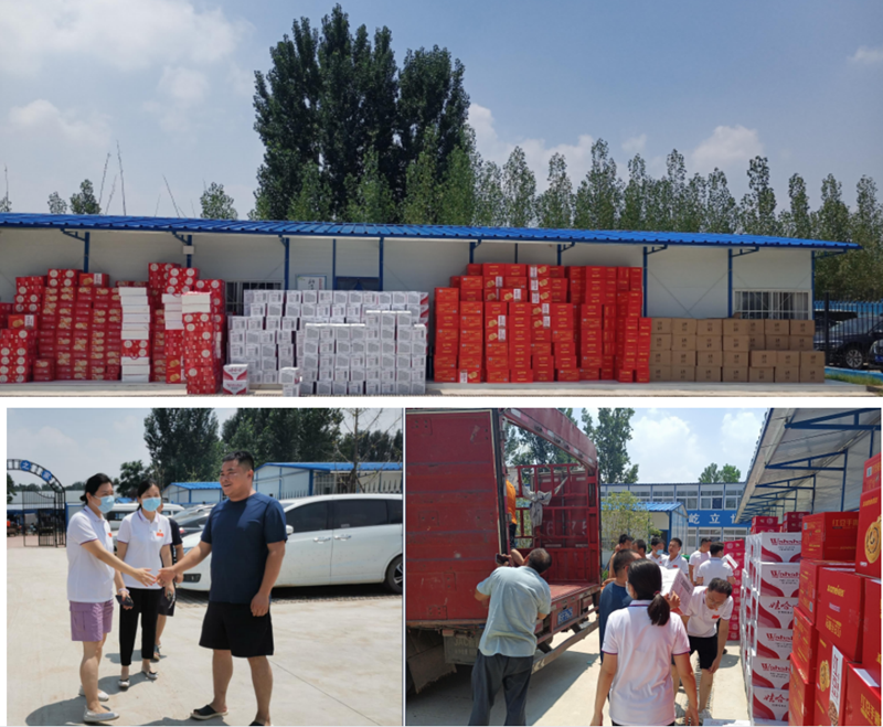 7月25日上午,曉曦總再次帶隊前往興達路街道辦黃崗廟村,向300戶受災村民捐贈礦泉水、牛奶、面包等食品物資。
