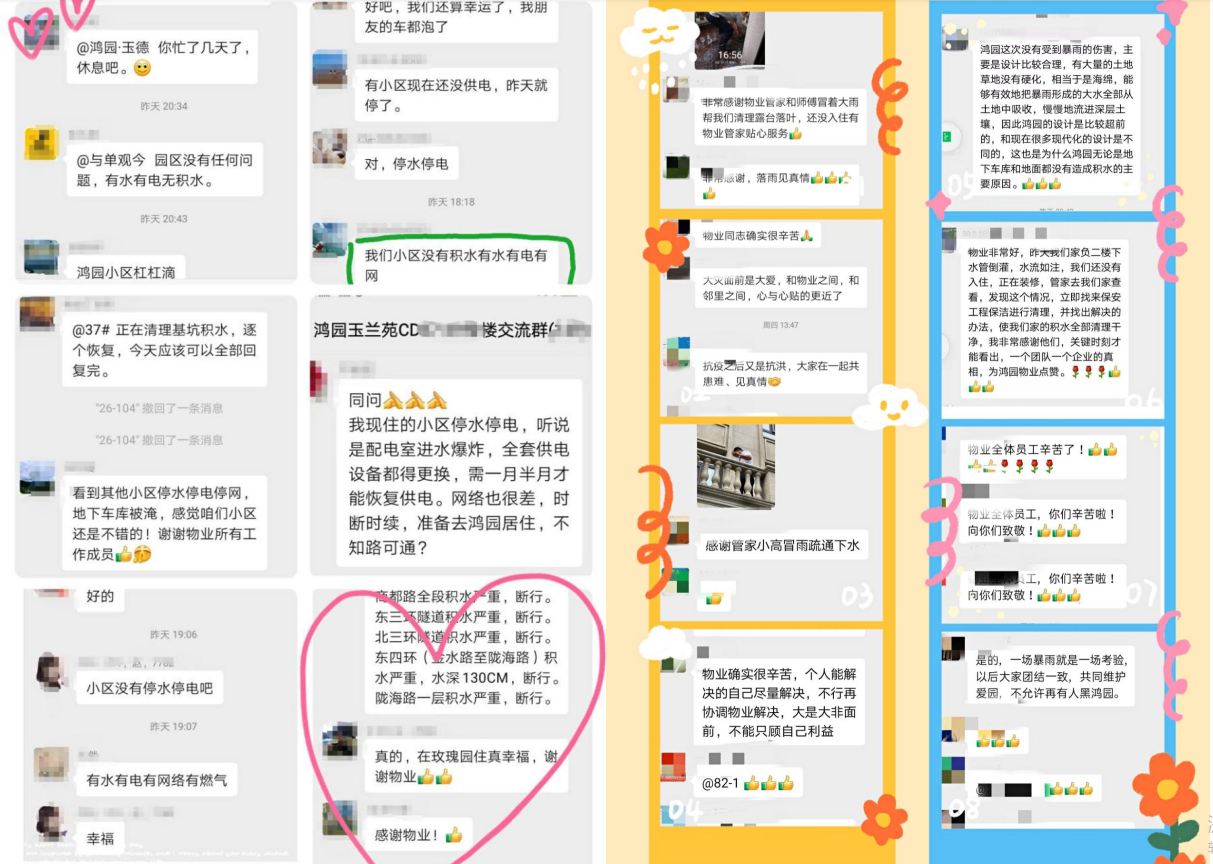 在本次汛情中,鴻寶所屬項目地庫無一被淹,園區地面無一積水,園區水電氣網基本從未停斷,并積極推進訊后救援修復工作,贏得了轄區居民的一致點贊和好評。