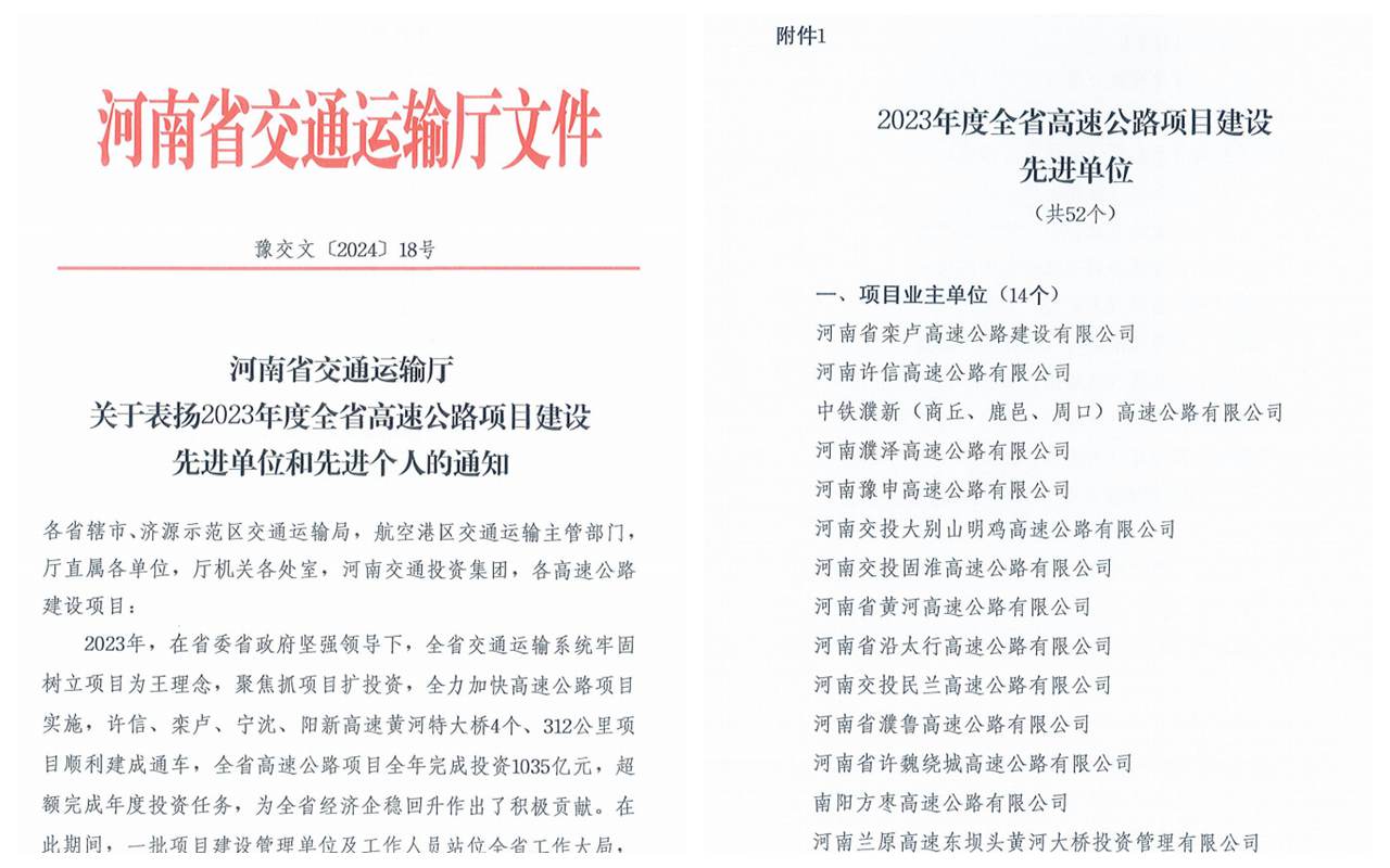 近日,河南省交通運輸廳發(fā)布《關于表揚2023年度全省高速公路項目建設先進單位和先進個人的通知》,蘭封高速項目公司被評為“2023年度全省高速公路項目建設先進單位”,公司副總工程師兼工程部經(jīng)理耿克強被評為“先進個人”。