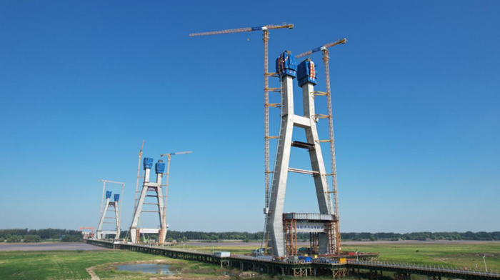 蘭封高速東壩頭黃河大橋主橋全長9104米,主橋采用主跨140+360+360+140米的鋼混組合梁三塔斜拉橋設計,塔柱外形為中原鼎型結構,主橋中塔89#墩高達160.5米,分27個節(jié)段進行澆筑;兩座邊塔88#墩、90#墩均為154.3米,分26個節(jié)段進行澆筑。歷經12個月的日夜奮戰(zhàn),蘭封高速黃河大橋88#墩主塔26個節(jié)段的施工任務提前兩個月完成。